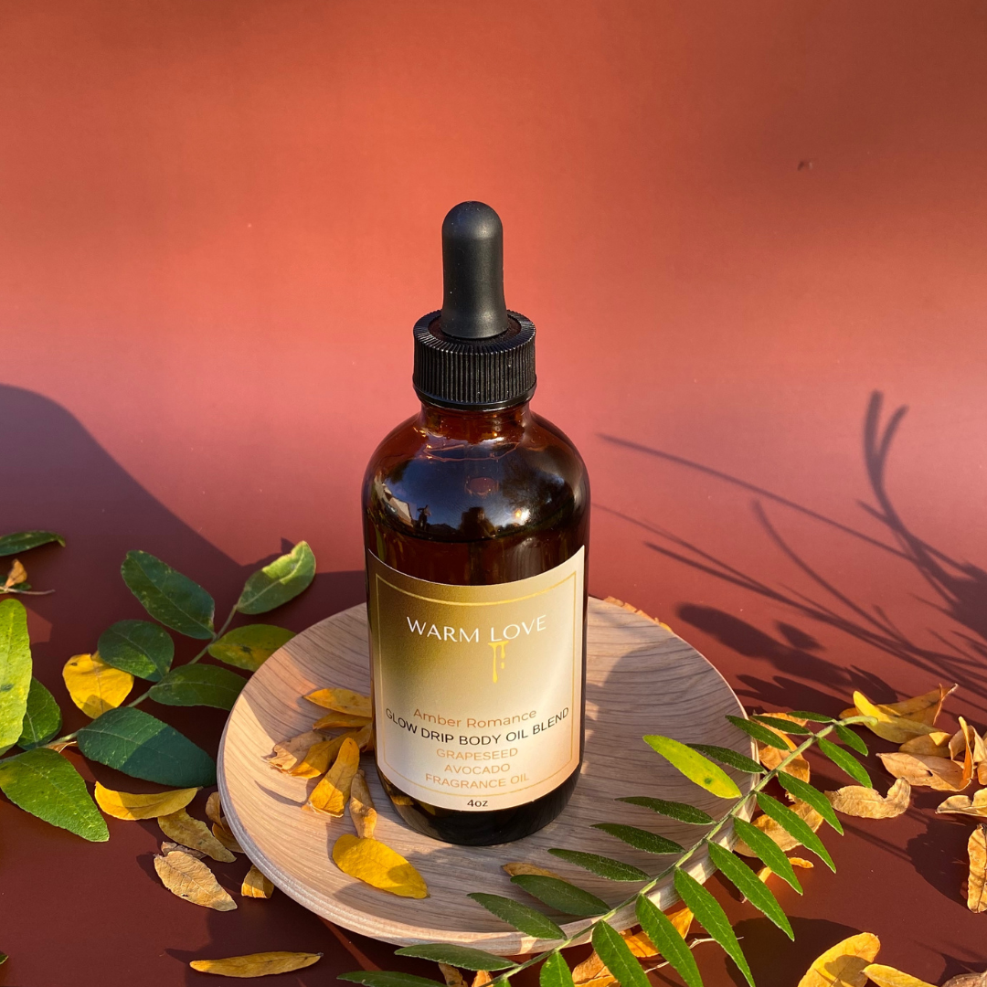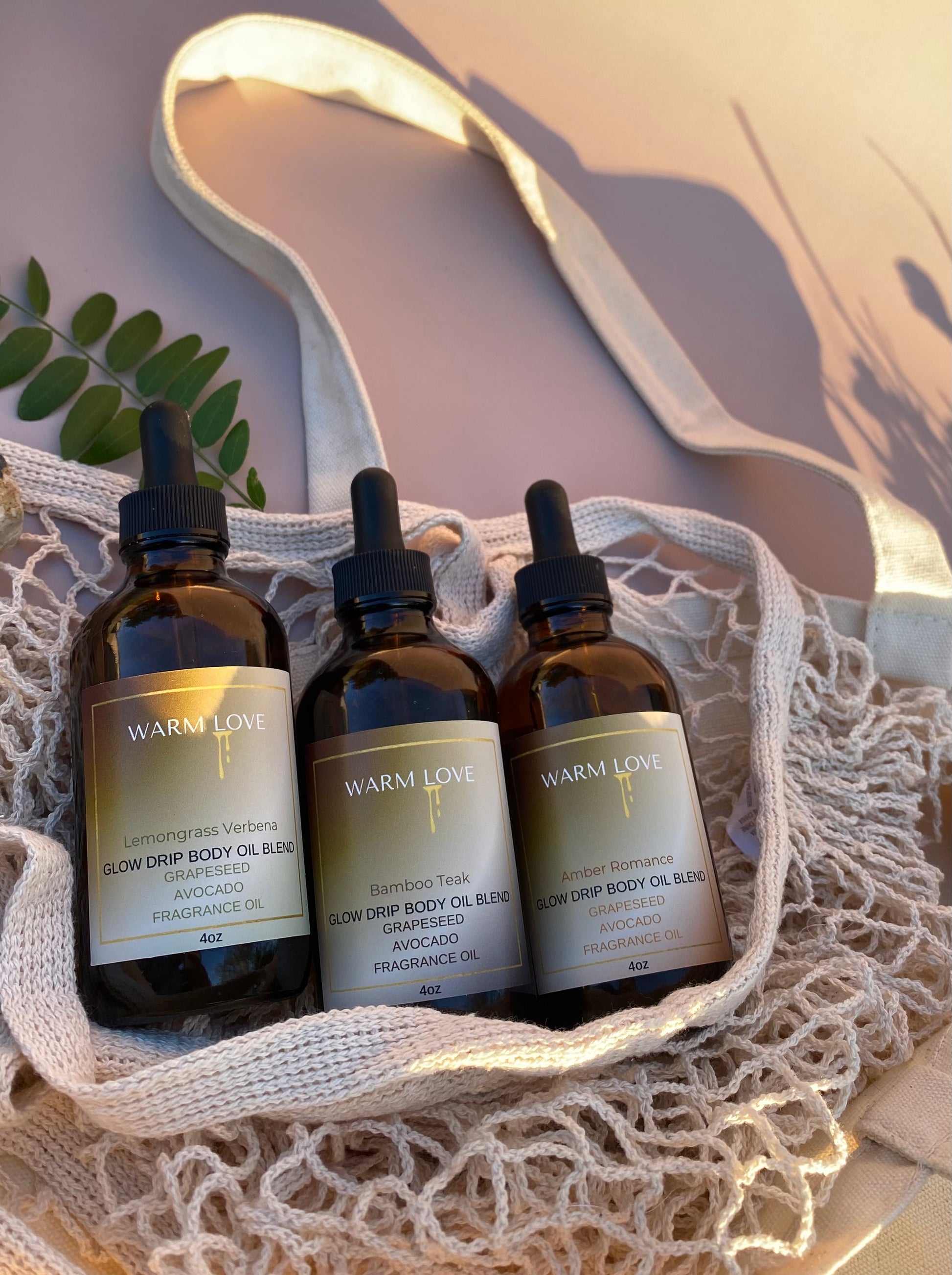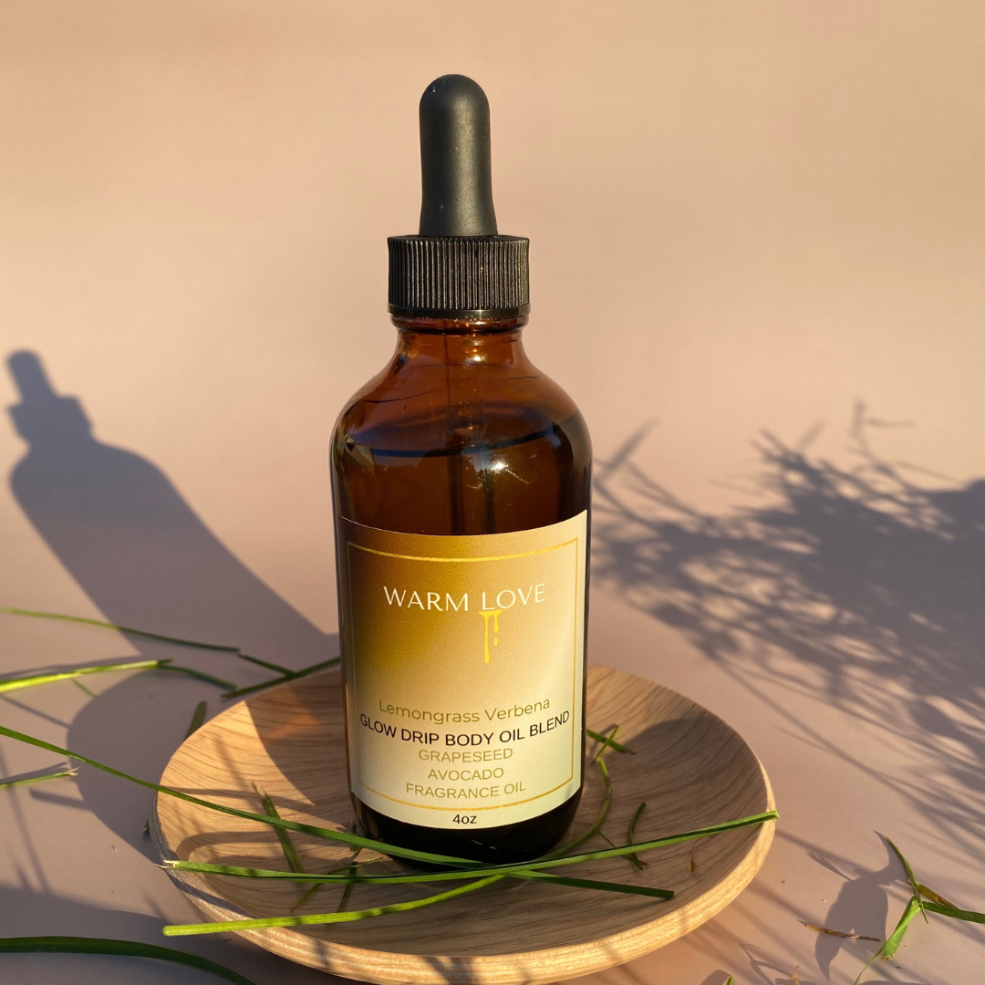 Introducing Warm Love's Glow Drip Body Oil Blends! To start this new collection off we launched this body oil in 3 different scents: Lemongrass, Amber Romance, and Bamboo Teak. This body oil will leave your skin nourished, glowing, and smelling amazing. This blend consists of organic and cold pressed plant-based oils, infused with essential oils/ fragrance oils. Suitable for all skin types.