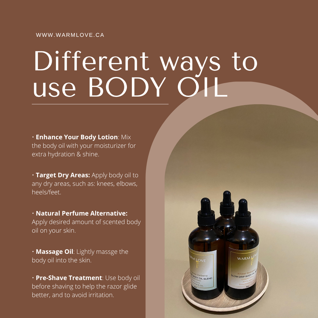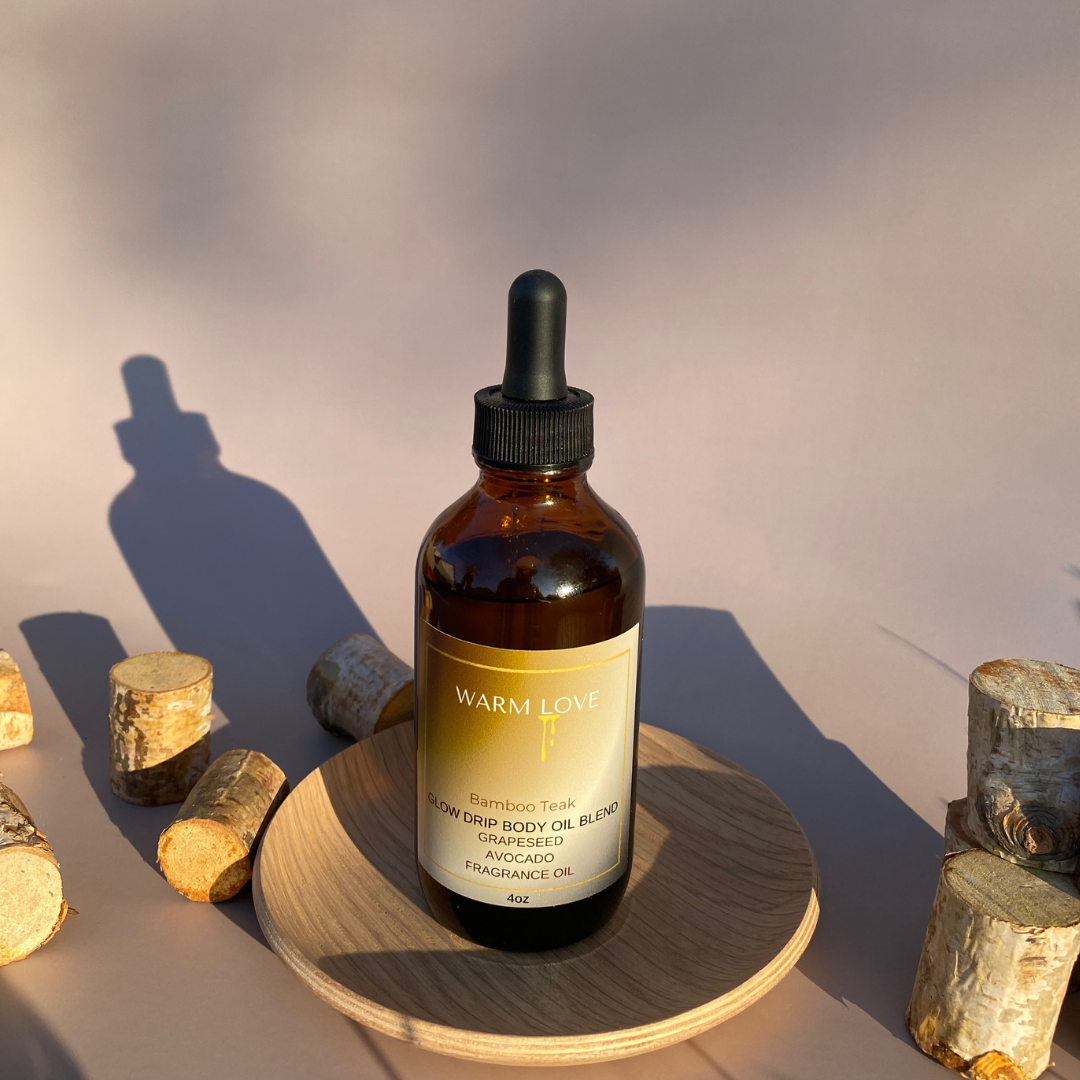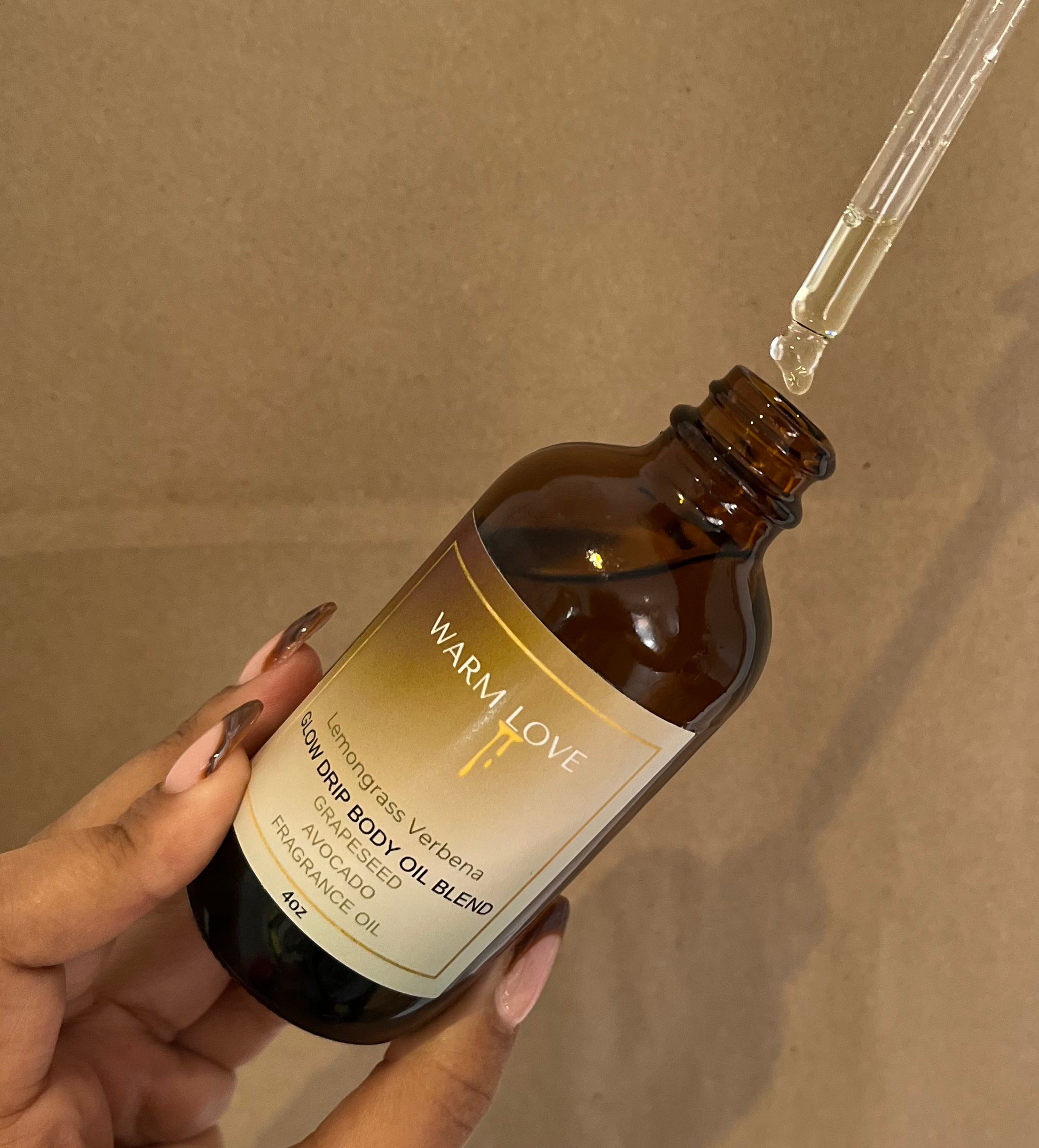 Introducing Warm Love's Glow Drip Body Oil Blends! To start this new collection off we launched this body oil in 3 different scents: Lemongrass, Amber Romance, and Bamboo Teak. This body oil will leave your skin nourished, glowing, and smelling amazing. This blend consists of organic and cold pressed plant-based oils, infused with essential oils/ fragrance oils. Suitable for all skin types.